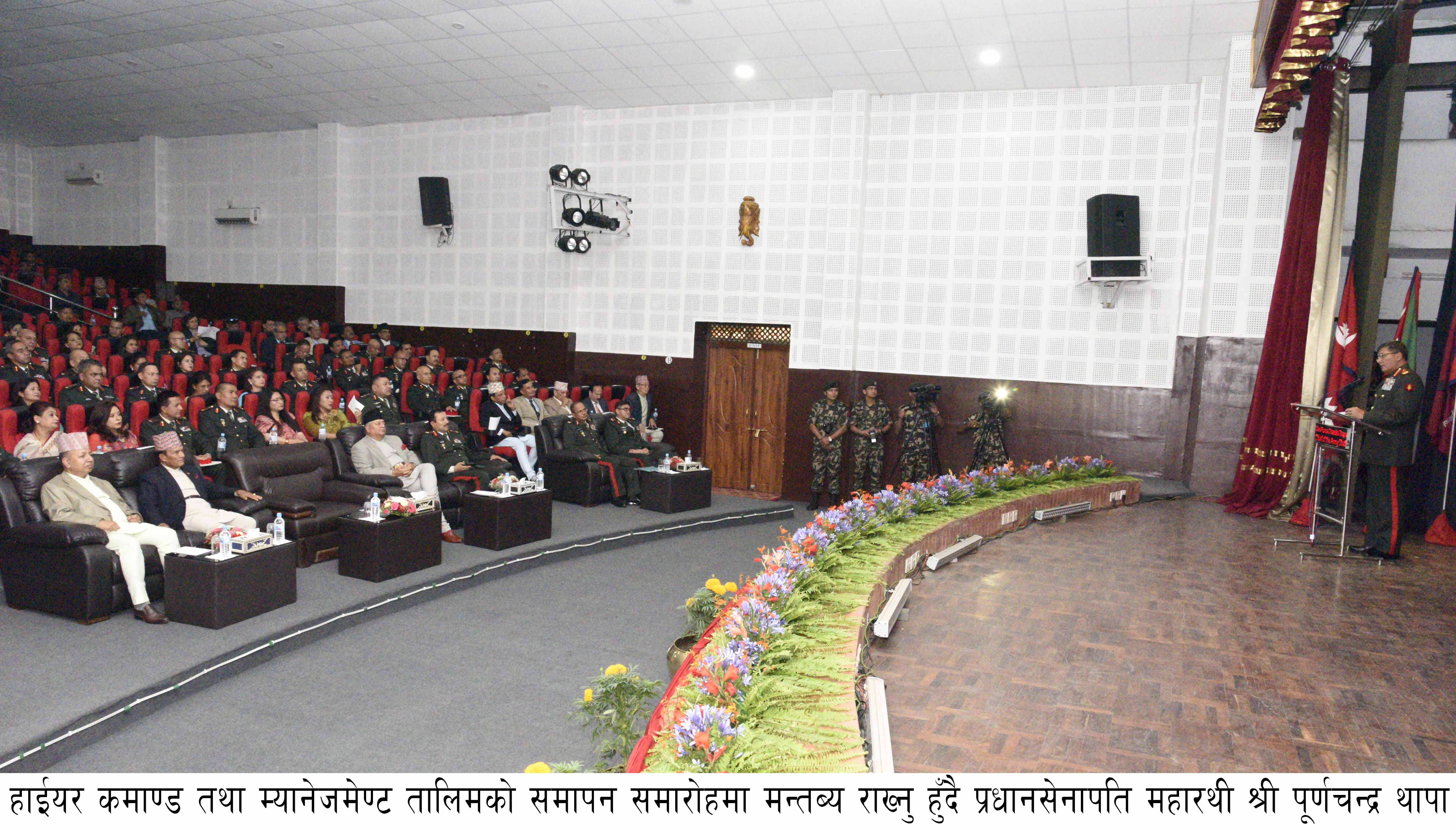 हायर कमाण्ड कोर्समा सहभागी उच्च सैनिक अधिकृतलाई सम्बोधन गर्दै प्रधानसेनापति थापाले भने ‘राष्ट्रिय सुरक्षासंग सम्बन्धित चुनौतिहरुलाई समेटेर अध्ययन, विश्लेषण र सुझावहरु दिई राष्ट्रिय सुरक्षा विश्वविद्यालय स्थापनाको अवधारणालाई परिणाममुखी बनाउन तपाईहरुले लिएको तालिम एक कोशे ढुंगा सावित हुनेछ भन्ने विश्वास मैले लिएको छु ।’