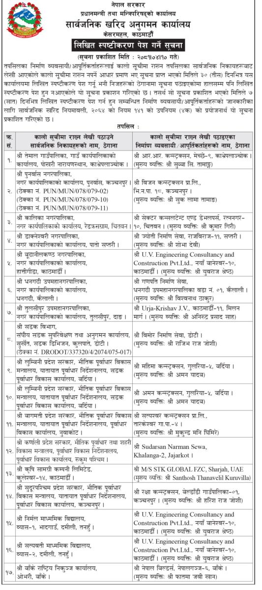 सार्वजनिक खरिद अनुगमन कार्यालयले आज सूचना जारी गर्दै सात दिनभित्र लिखित स्पष्टीकरण पेस गर्न अल्टिमेटम दिएको छ । यो अवधिमा लिखित स्पष्टीकरण नदिए कम्पनीहरू कालो सूचीमा पर्नेछन् ।