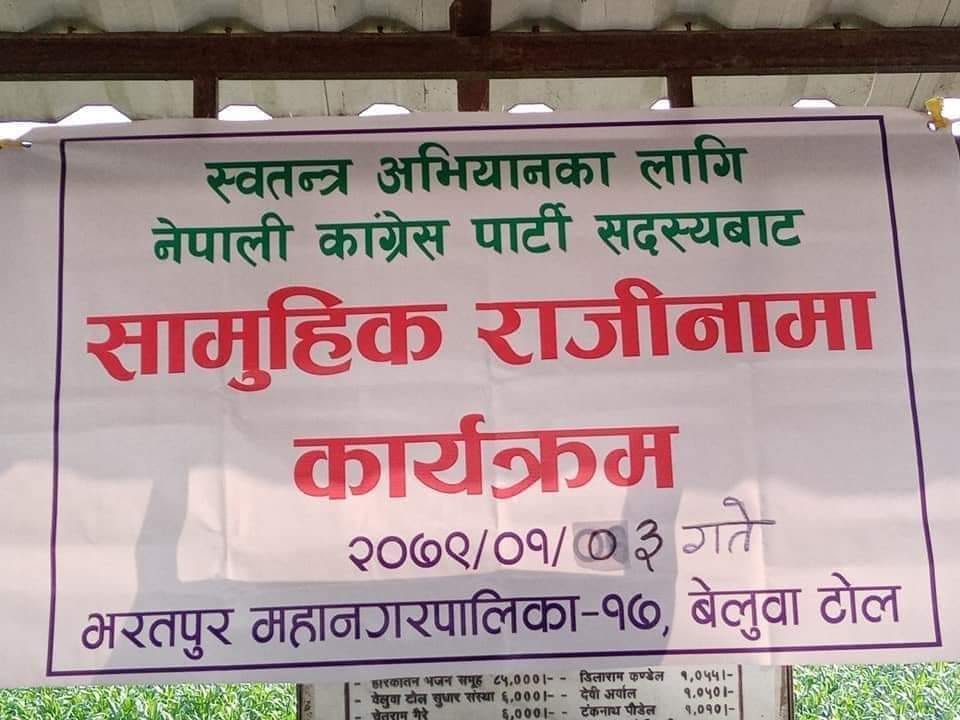 चितवन- स्वतन्त्र अभियानका लागि भन्दै भरतपुर महानगरपालिका–१७ बेलुवा टोलका ५० जना कांग्रेस नेताकार्यकर्ताले शनिबार सामूहिक राजीनामा दिएका छन् ।
