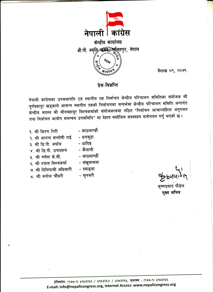 कांग्रेस उपसभापति एवं स्थानीय तह निर्वाचन केन्द्रीय परिचालन समितिका संयोजक पूर्णबहादुर खड्काले आसन्न स्थानीय तहको निर्वाचनका सन्दर्भमा केन्द्रीय परिचालन समितिअन्तर्गत केन्द्रीय सदस्य मीनबहादुर विश्वकर्माको संयोजकत्वमा गठित उपसमितिमा विभिन्न जिल्लाका आठजनालाई मनोनीत गरेको कांग्रेस मुख्यसचिव कृष्णप्रसाद पौडेलले जारी गरेको विज्ञप्तिमा उल्लेख छ ।