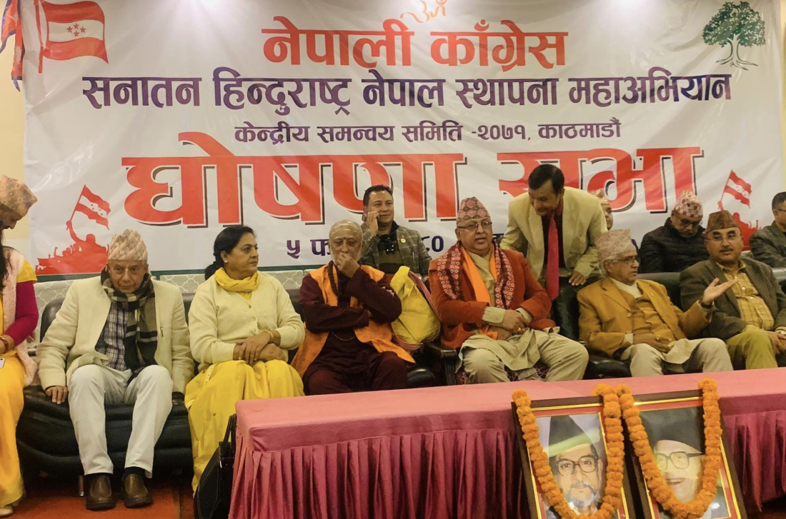 यसअघि कांग्रेसको केन्द्रीय समिति बैठकमा पनि हिन्दूराष्ट्रको एजेन्डा उठेको थियो । पार्टी सनातन हिन्दूराष्ट्र नेपालको पक्षमा उभिनुपर्ने भन्दै २२ जना केन्द्रीय सदस्यले हस्ताक्षर संकलन गरेर बैठकमा बुझाएका थिए ।