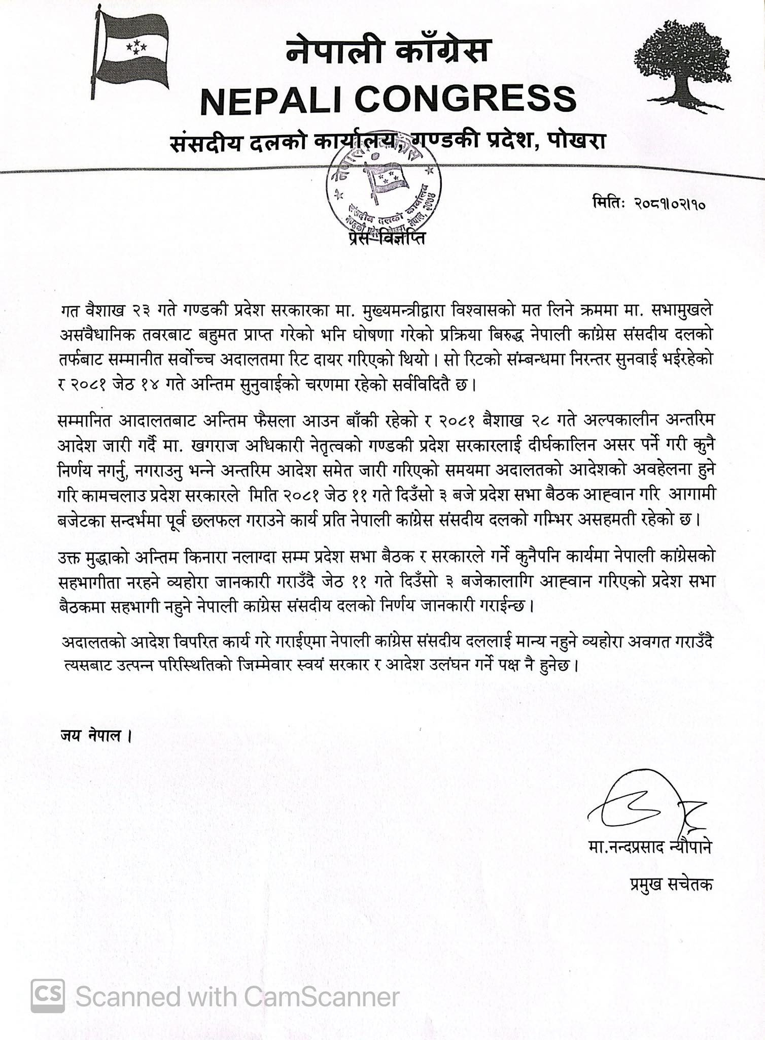 अदालतको आदेशको अवहेलना हुने गरी कामचलाउ सरकारले मिति २०८१ जेठ ११ गते अपराह्न ३ बजे प्रदेश सभा बैठक आह्वान गरेर आगामी बजेटका सन्दर्भमा पूर्व छलफल गराउने कार्यप्रति नेपाली कांग्रेस संसदीय दलले गम्भीर असहमति जनाउँदै बैठक बहिस्कार गर्ने निर्णय गरेको प्रमुख सचेतक नन्दप्रसाद न्यौपानेले विज्ञप्तिमार्फत जनाएका छन् ।