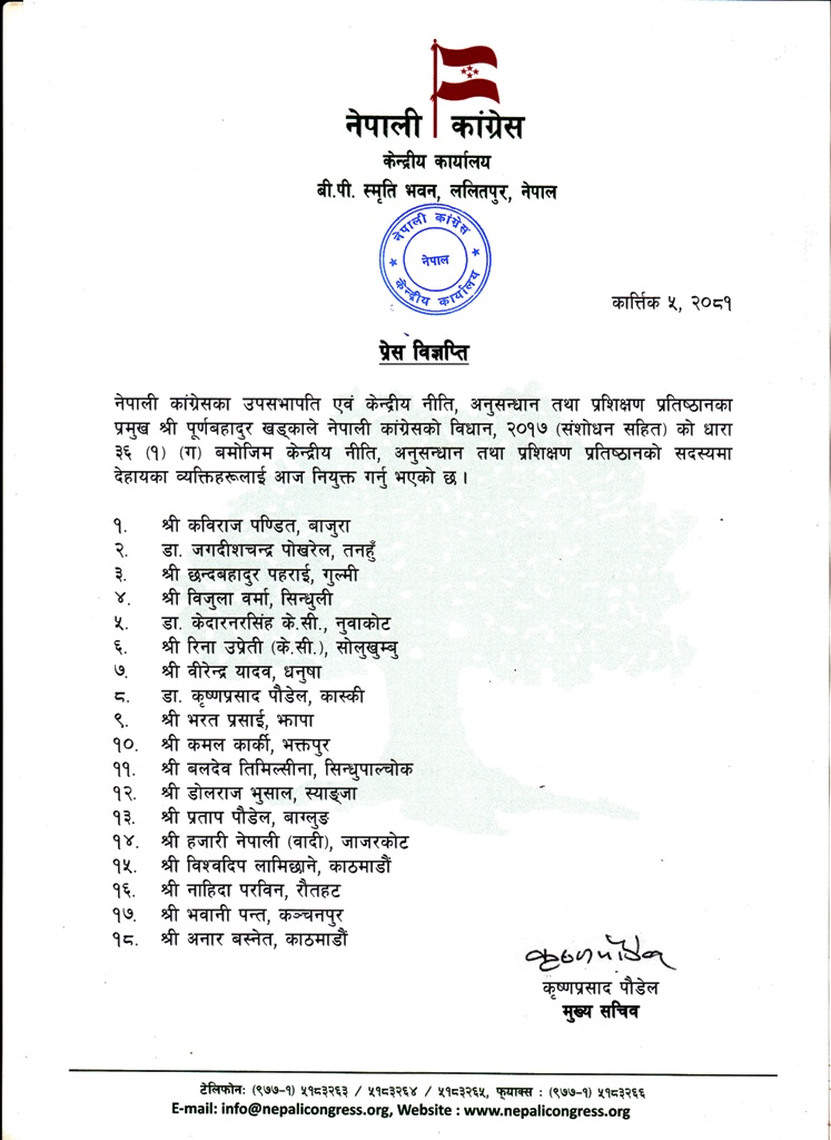 काठमाण्डु – नेपाली कांग्रेसको केन्द्रीय नीति, अनुसन्धान तथा प्रशिक्षण प्रतिष्ठानको सदस्यमा १८ जनालाई नियुक्त गरिएको छ ।