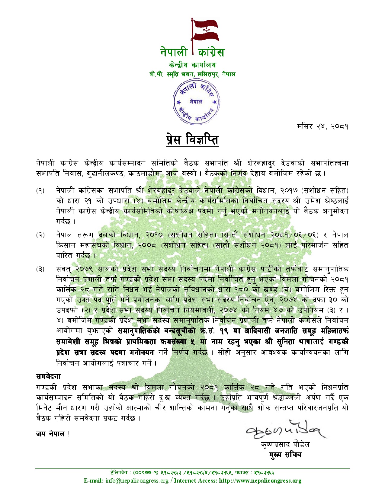 कांग्रेसले सभापति देउवाले उमेश श्रेष्ठलाई कोषाध्यक्ष पदमा गरेको मनोनयन अनुमोदन गरेको छ भने नेपाल तरुण दल र नेपाल किसान महासंघको विधान अनुमोदन गरेको छ । आवश्यक कार्यान्वयनका लागि निर्वाचन आयोगलाई पत्राचार गर्ने निर्णय भएको मुख्य सचिव कृष्णप्रसाद पौडेलद्वारा जारी विज्ञप्तिमा उल्लेख छ ।