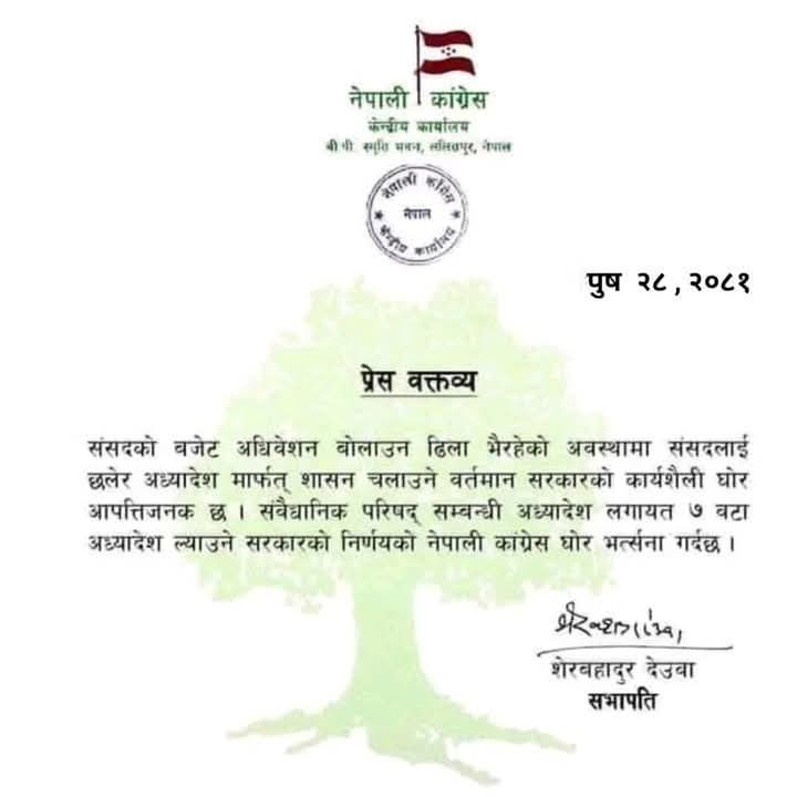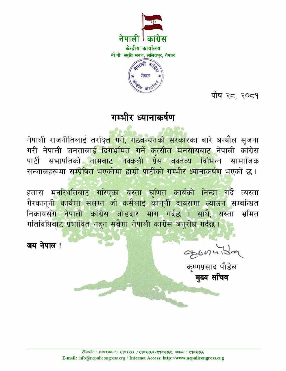 उनले भनेका छन्, ‘नेपाली राजनीतिलाई तरङ्गित गर्ने, गठबन्धनको सरकारका बारे अन्योल सिर्जना गरी नेपाली जनतालाई दिग्भ्रमित गर्ने कुत्सित मनसायबाट नेपाली कांग्रेस पार्टी सभापतिको नामबाट नक्कली प्रेस वक्तव्य विभिन्न सामाजिक सञ्जालहरूमा सम्प्रेषित भएकोमा हाम्रो पार्टीको गम्भीर ध्यानाकर्षण भएको छ ।’