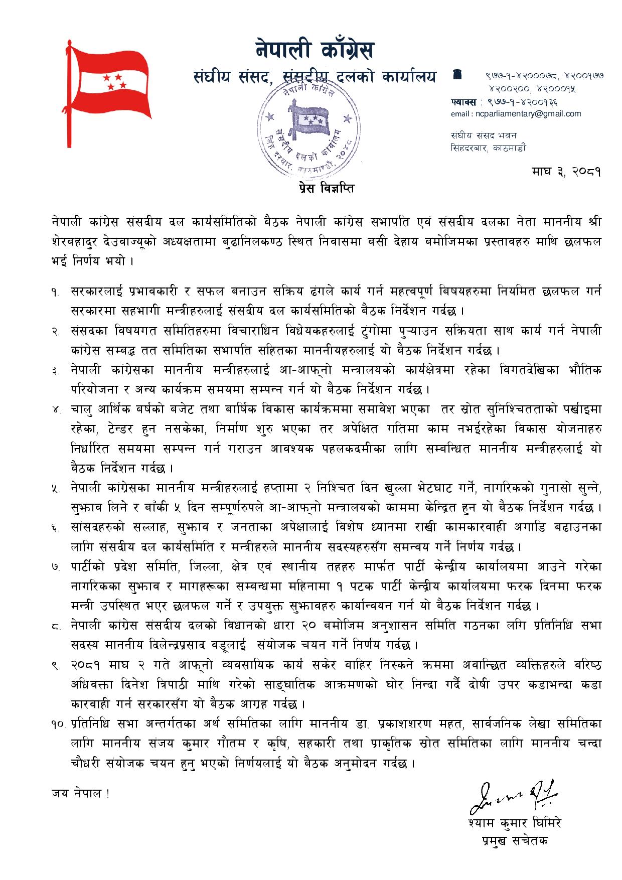 कांग्रेस संसदीय दलका प्रमुख सचेतक श्याम कुमार घिमिरेले विज्ञप्ति जारी गर्दै निर्णयबारे जानकारी दिएका छन् ।