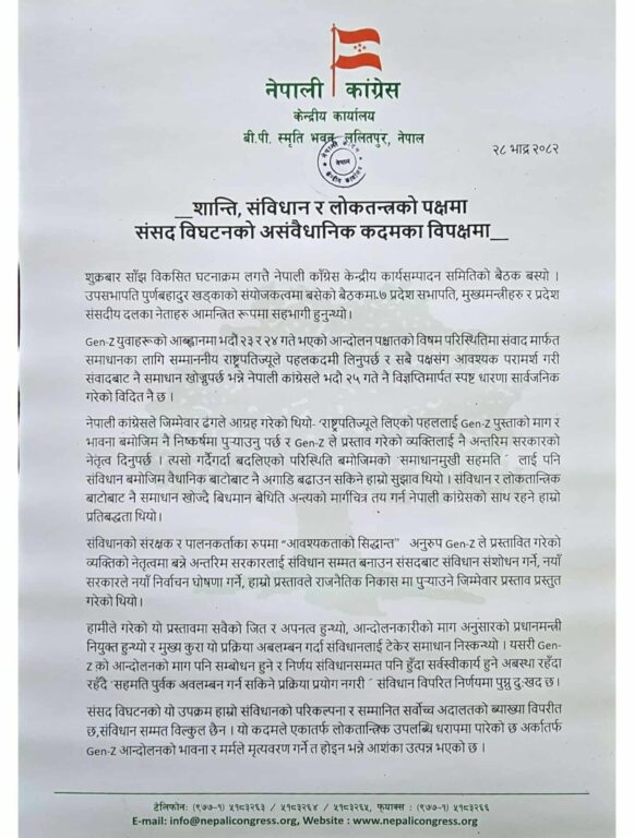 कांग्रेसले अगाडि भनेको छ, ‘त्यसैले यो अवस्थामा एकातर्फ कसैले उत्तेजना नफैलाओस् र अर्कोतर्फ संवैधानिक रिक्ततामा टेकेर जनताले दशकौंको संघर्षबाट प्राप्त लोकतान्त्रिक उपलब्धि उल्ट्याउने दुष्प्रयास नहोस् भन्नेतर्फ पनि सचेततापूर्वकध्यान दिनुपर्नेछ। यो गुरुत्तर दायीत्व नेपाली कांग्रेससंग अपेक्षित छ। यस्तो चुनौतीपूर्ण अवस्थामा स्थितिलाई थप बिग्रिन नदिन र संघीय लोकतान्त्रिक गणतन्त्र नेपालको संविधानलाई लिक बाहिर जान नदिन नेपाली कांग्रेसले पार्टिभित्र, अन्य राजनितिक दल तथा नागरिक समाजलगायतसँग समेत परामर्श र संवाद गरी शान्ति, लोकतन्त्र, अग्रगमन र समुन्नतिका पक्षमा नेतृत्वदायी भूमिका निर्वाह गर्ने निर्णय गरिएको छ।’