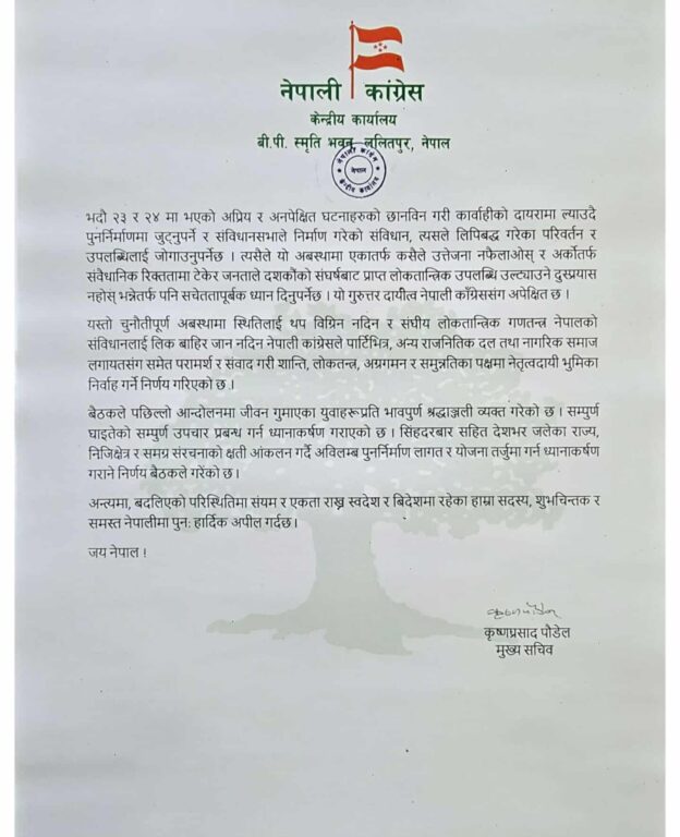 यसले लोकतन्त्र नै धरापमा पारेको दाबी गर्दै जेनजेड आन्दोलन नै खेर जाने आशंका उत्पन्न भएको निष्कर्ष कांग्रेसले निकालेको हो ।