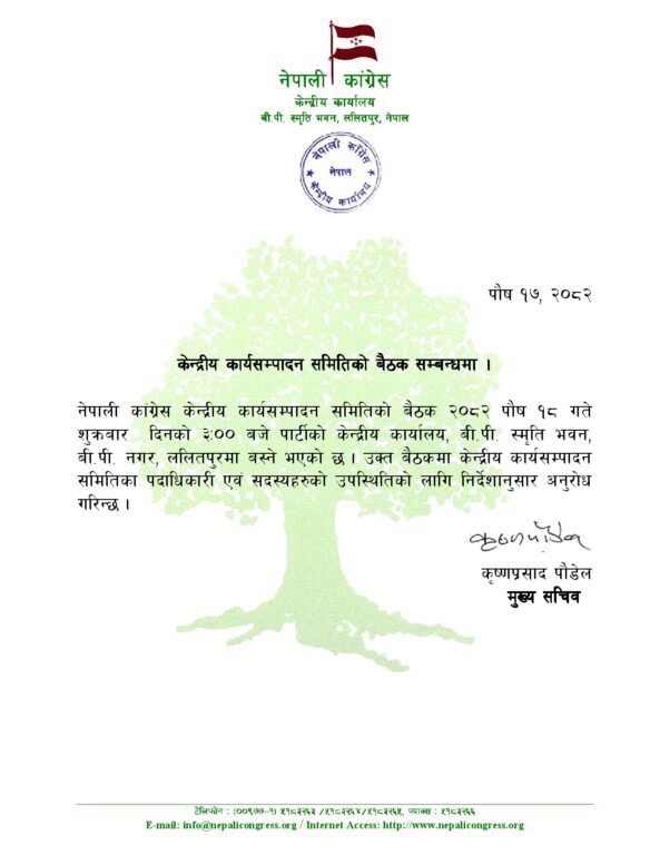 पार्टीका मुख्यसचिव कृष्णप्रसाद पौडेलले बिहीबार राति विज्ञप्ति जारी गर्दै शुक्रबार दिउँसो ३ केन्द्रीय कार्यालयमा बैठक बस्ने जानकारी दिए ।