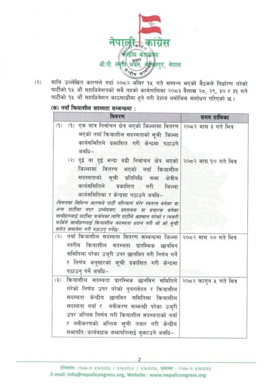 मंसिर १५ गते बसेको केन्द्रीय कार्यसमिति बैठकले १५ औँ महाधिवेशनको कार्यतालिका सर्वसम्मत रूपमा पारित गरेको थियो। सोही बैठकको मर्मलाई आधार मान्दै पार्टीले अहिले नयाँ परिपत्र जारी गरेको हो।