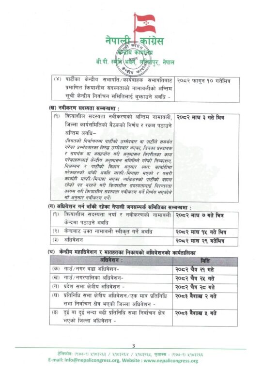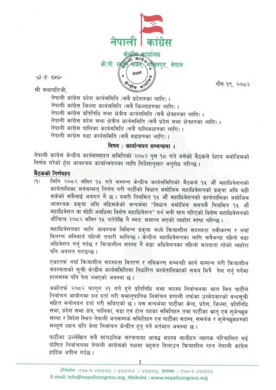 नियमित महाधिवेशन वैशाखमा हुने जानकारीसहितको परिपत्रमा कांग्रेस केन्द्रीय कार्यालयका मुख्य सचिव कृष्णप्रसाद पौडेलको हस्ताक्षर छ।