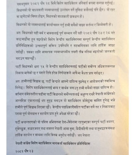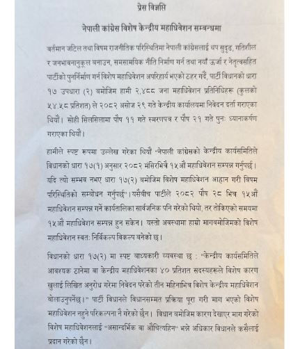 विशेष महाधिवेशन मागकर्ता महाधिवेशन प्रतिनिधिहरूले जारी गरेको विज्ञप्तिमा भनिएको छ …’विधानको मर्म र भावनालाई पूर्ण सम्मान गर्दै यही २०८२ पौष २७ र २८ गते काठमाण्डुमा हुन गइरहेको विशेष केन्द्रीय महाधिवेशनमा सम्पूर्ण केन्द्रीय महाधिवेशन प्रतिनिधिहरूको उत्साहपूर्ण सक्रिय उपस्थिति र सहभागिताका लागि हार्दिक आग्रह गर्दछौ। यसका लागि आवश्यक व्यवस्थापकीय तयारी तीव्र गतिमा भइरहेको जानकारी गराउन चाहन्छौ ।हामीलाई विश्वास छ, पार्टी केन्द्रले आफ्नो दायित्व बुझ्नेछ र आयोजनाको स्वामित्व लिनेछ।’