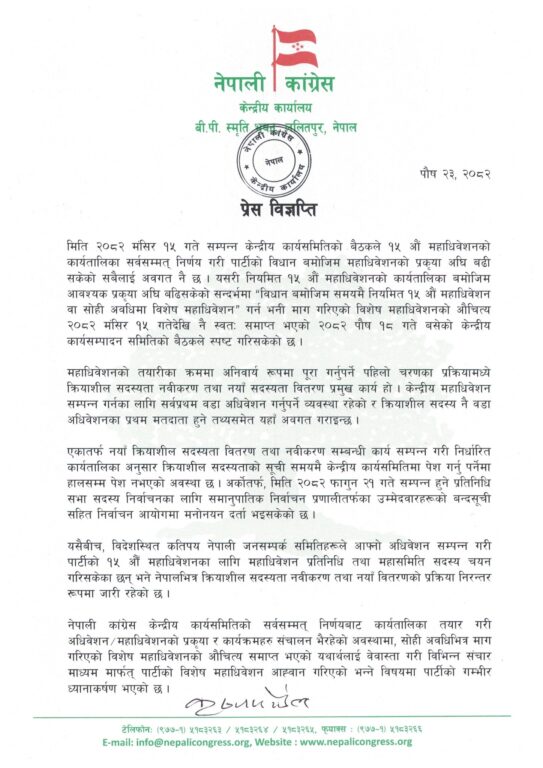 विधान विपरीतका गतिविधिमा नलाग्न अपिल विगत केही दिनदेखि विभिन्न सञ्चारमाध्यममार्फत पार्टीको विशेष महाधिवेशन आह्वान गरिएको भन्ने समाचारप्रति ध्यानाकर्षण भएको जनाउँदै कांग्रेसले कुनै पनि तहको अधिवेशन बोलाउने अधिकार व्यक्तिगत रूपमा पदाधिकारी वा सदस्यलाई नभई केवल केन्द्रीय कार्यसमितिलाई मात्र भएको स्मरण गराएको छ ।