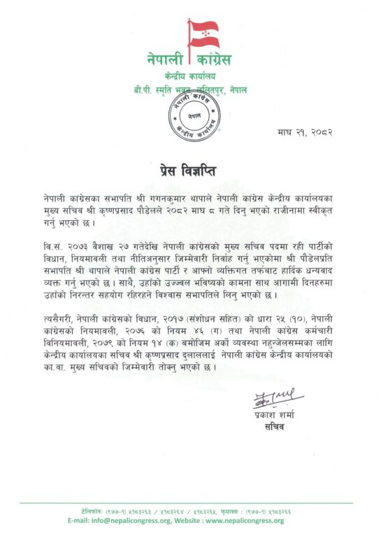 पार्टी सभापति गगनकुमार थापाले पौडेलले गत माघ ८ गते पेश गरेको राजीनामा बुधबार स्वीकृत गरेका हुन् ।