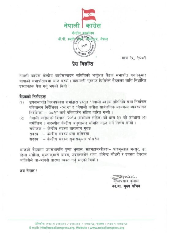 काठमाण्डु – नेपाली कांग्रेस केन्द्रीय कार्यसम्पादन समितिको भर्चुअल बैठकले आईतबार २ निर्देशिका पारित गरेको छ ।