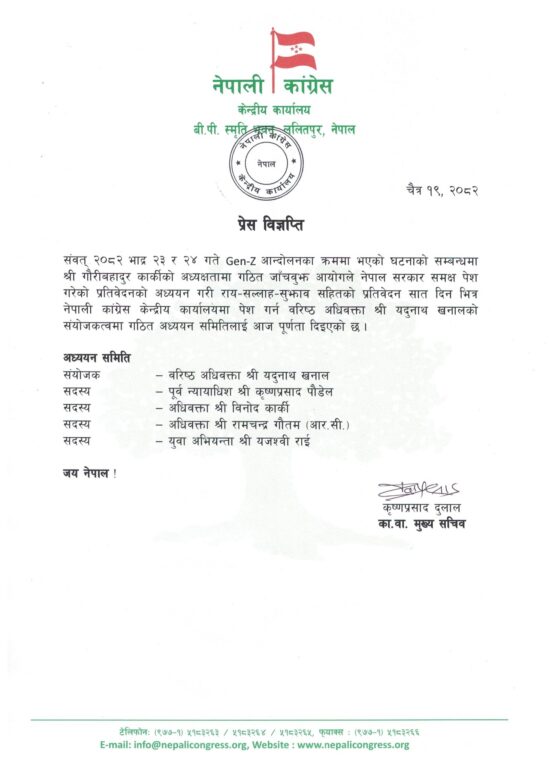काठमाण्डु – नेपाली कांग्रेसले संवत् २०८२ भदौ २३ र २४ गते भएको जेनजी आन्दोलनका क्रममा घटेका घटनाहरूको सम्बन्धमा तयार पारिएको प्रतिवेदन अध्ययन गर्न एक समिति गठन गरेको छ ।