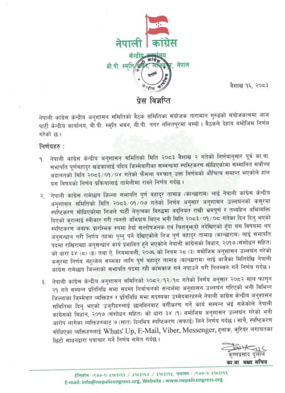 अनुशासन उल्लंघनको आरोप लागेका व्यक्तिहरूबाट ७ दिनभित्र सफाइ पेश गर्न स्पष्टीकरण सोध्ने निर्णय भएको छ । ती व्यक्तिहरूलाई ह्वाट्सएप, इमेल, भाइबर, मेसेन्जर, हुलाक र कुरियर जस्ता छिटो साधन प्रयोग गरी पत्राचार गरिने कार्यबाहक मुख्य सचिव कृष्णप्रसाद दुलालद्वारा जारी प्रेस विज्ञप्तिमा जनाइएको छ ।