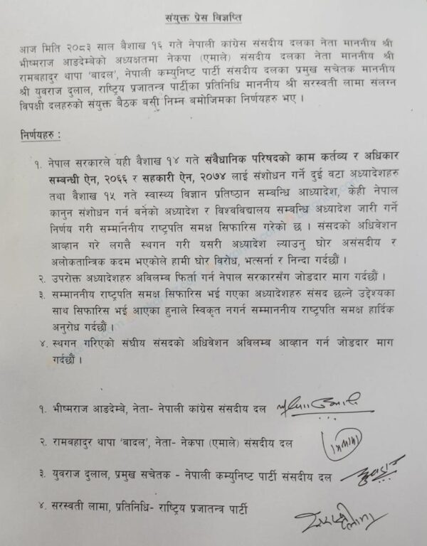 विपक्षी ४ दलहरूद्वारा जारी संयुक्त प्रेस विज्ञप्तिमा वैशाख १४ र १५ गते सिफारिस गरिएका आधा दर्जन अध्यादेशहरू फिर्ता लिन जोडदार माग गरिएको छ । विशेषगरी संवैधानिक परिषद् (काम, कर्तव्य र अधिकार) सम्बन्धी ऐन र सहकारी ऐनमा गर्न खोजिएको संशोधनले राज्यका संवैधानिक निकाय र जनचासोका विषयमा सरकारी हस्तक्षेप बढ्ने उनीहरूको दाबी छ ।