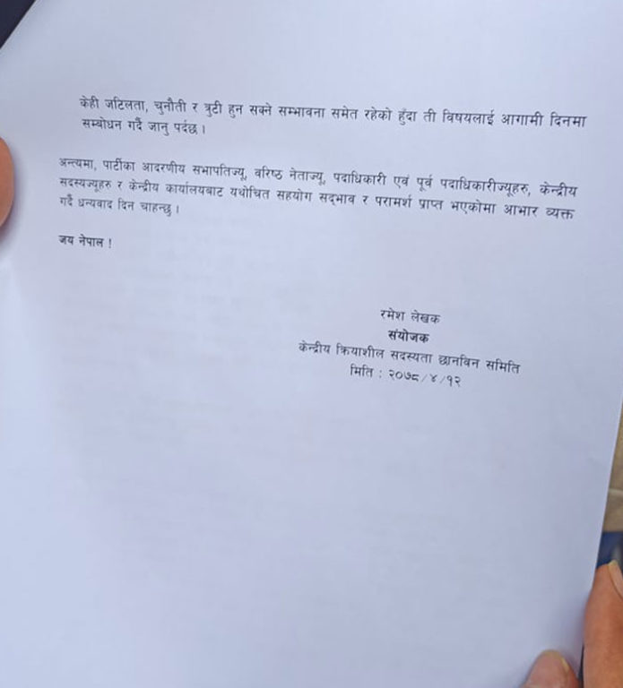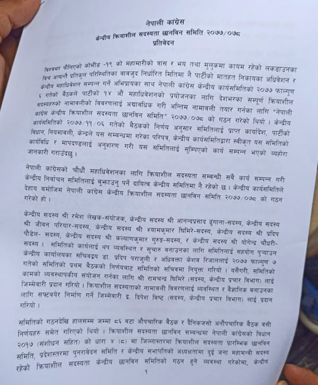 काठमाण्ड – नेपाली कांग्रेसको क्रियाशील सदस्यता छानबिन समितिले प्रतिवेदन बुझाएको छ ।