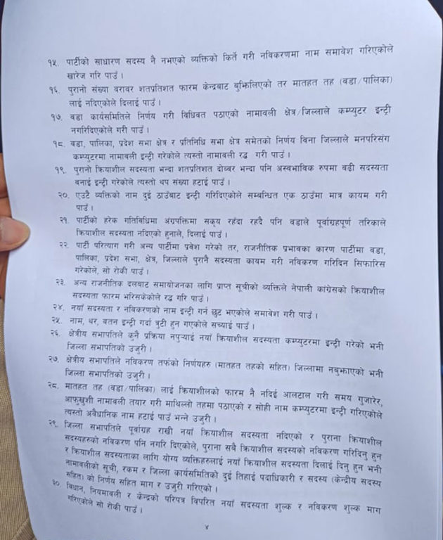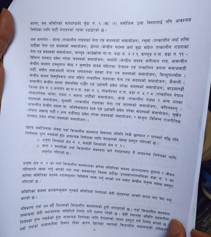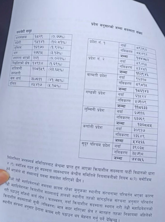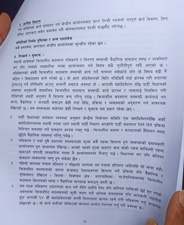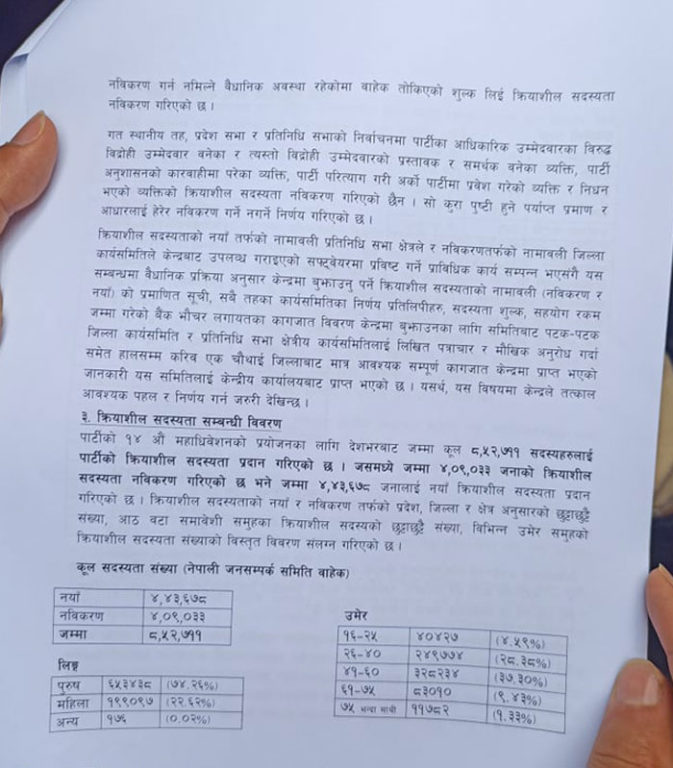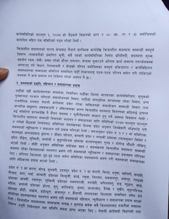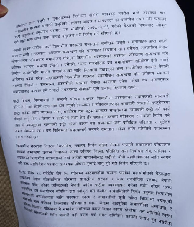 मंगलबार प्रधानमन्त्री शेरबहादुर देउवाको निजी निवास बूढानीलकण्ठमा बसेको पदाधिकारीको बैठकमा समितिले १३ पृष्ठको प्रतिवेदन पार्टी सभापति देउवालाई हस्तान्तरण गरेको हो । जसअन्तर्गत नेपाली कांग्रेसले आठ लाख ५२ हजार ७ सय ११ जना क्रियाशील सदस्य बनाएको छ ।