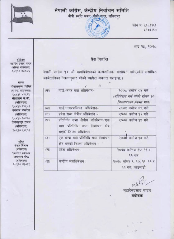 शुक्रबार बसेको कांग्रेस पदाधिकारी बैठकले गाउँ–नगरपालिका, प्रदेशसभा क्षेत्रीय अधिवेशन, प्रतिनिधिसभा क्षेत्रीय अधिवेशन–एकमात्र प्रतिनिधिसभा निर्वाचन क्षेत्र भएका जिल्लाको जिल्ला अधिवेशन र एकभन्दा बढी प्रतिनिधिसभा निर्वाचन क्षेत्र भएका जिल्लाको अधिवेशनको नयाँ मिति प्रस्ताव गरेको थियो । सोही प्रस्तावअनुसार निर्वाचन समितिले निर्वाचन कार्यतालिका मिति हेरफेर गररेको हो ।
