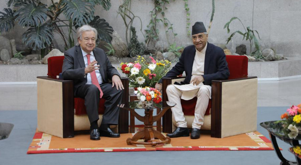 काठमाण्डु – नेपालको औपचारिक भ्रमणमा रहेका संयुक्त राष्ट्रसङ्घका महासचिव एन्टोनियो गुटेरेस र नेपाली कांग्रेसका सभापति एवं पूर्वप्रधानमन्त्री शेरबहादुर देउवाबीच भेटवार्ता भएको छ।