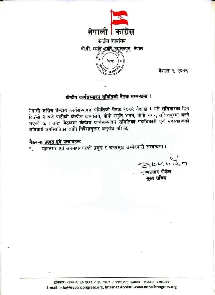 काठमाण्डु – नेपाली कांग्रेसका सभापति शेरबहादुर देउवाले कार्यसम्पादन समितिको बैठक बोलाएका छन् । प्रधानमन्त्री समेत रहेका देउवाले शनिबार दिउँसो २ बजे पार्टी केन्द्रीय कार्यालय सानेपामा बैठक बोलाएका हुन् ।