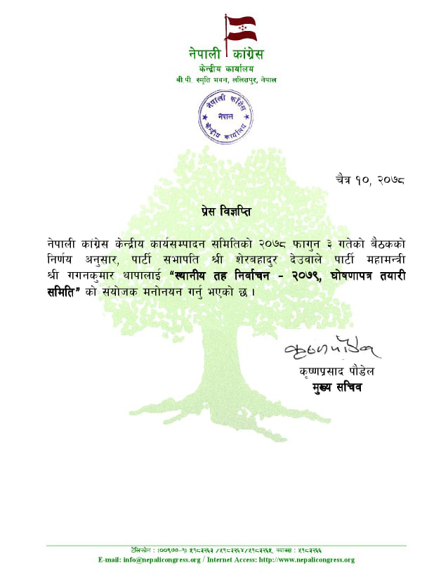 सभापति शेरबहादुर देउवाले कार्यसम्पादन समितिको म्याण्डेटअनुसार स्थानीय तह निर्वाचन २०७९, घोषणापत्र तयारी समितिको संयोजकको जिम्मेवारी महामन्त्री थापालाई दिएका हुन् ।
