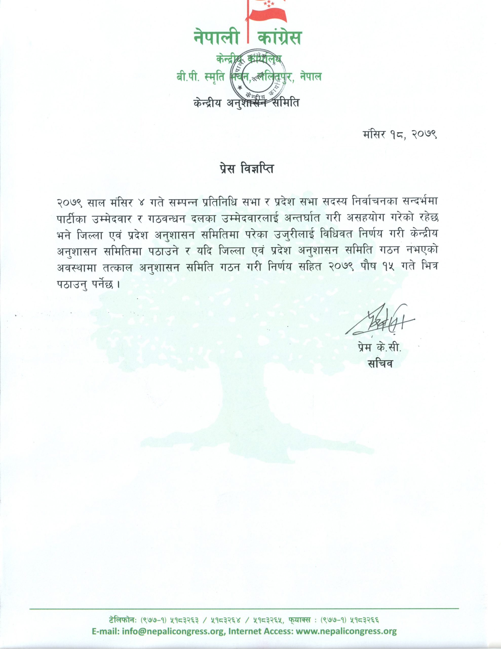 जिल्ला एवम् प्रदेश अनुशासन समितिमा परेका उजुरीलाई विधिवत निर्णय गरी पठाउने र यदि जिल्ला एवम् प्रदेश अनुशासन समिति गठन नभएको अवस्थामा तत्काल अनुशासन समिति गठन गरेर पुस १५ गतेभित्र सूची पठाउन केन्द्रीय अनुशासन समितिले विज्ञप्तिमार्फत अनुरोध गरेको छ।