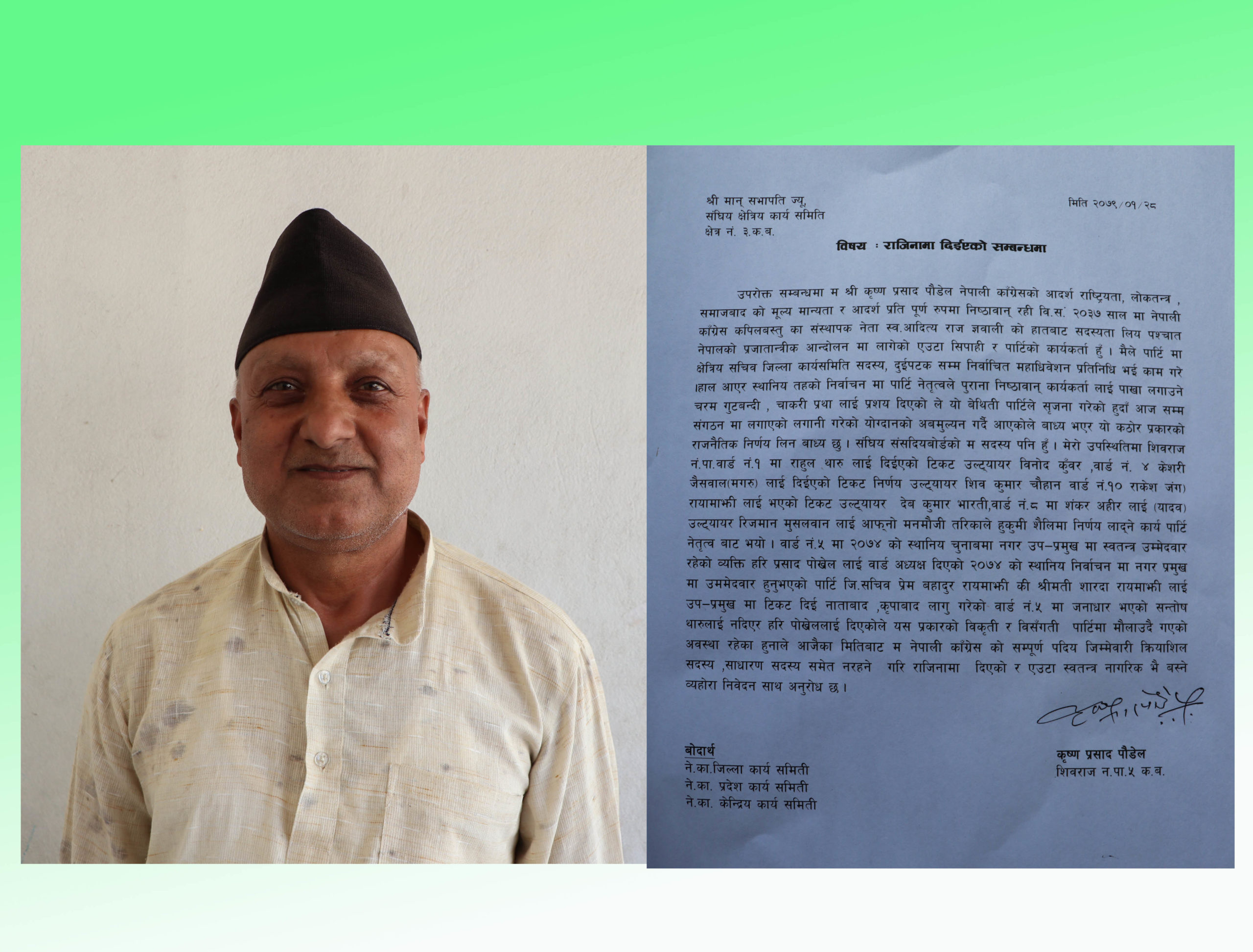 कपिलवस्तु – नेपाली कांग्रेसका महाधिवेशन प्रतिनिधि तथा संसदीय बोर्ड टिकट वितरण समितिको सदस्यसमेत रहेका कपिलवस्तुका कृष्णप्रसाद पौडेलले पार्टीबाट राजीनामा दिएका छन् ।