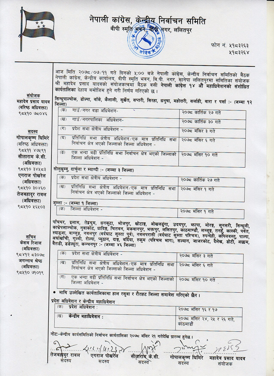 काठमाण्डु – नेपाली कांग्रेसको १४ औं महाधिवेशन मंसिर २४ गतेदेखि हुने भएको छ । केन्द्रीय निर्वाचन समितिले बिहीबार नयाँ मिति सार्वजनिक गरेको हो । सार्वजनिक कार्यतालिकाअनुसार केन्द्रीय महाधिवेशन मंसिर २४, २५ र २६ गते काठमाण्डुमा हुनेछ ।