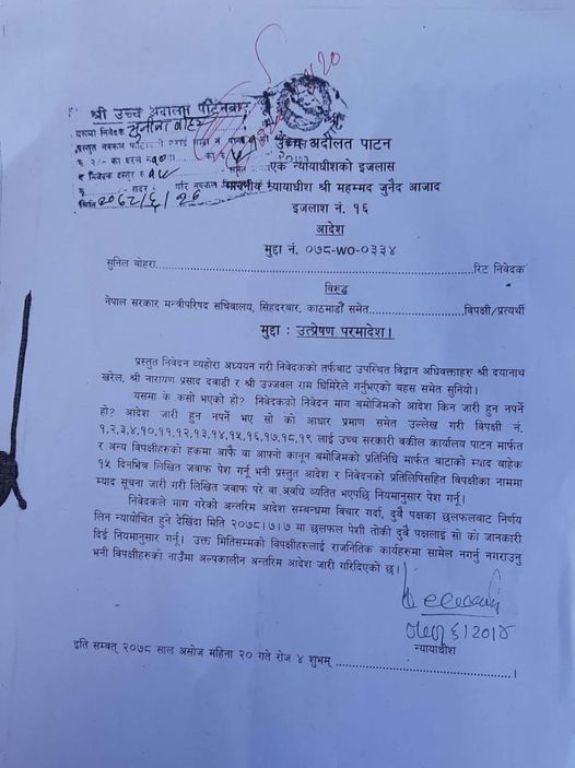 उनको माग बमोजिम उच्च अदालतले राज्यकोषबाट तलब भत्ता लिने शिक्षक र कर्मचारीहरूलाई राजनीतिक कार्यमा संलग्न नगर्न/नगराउन बुधबार अन्तरिम आदेश जारी गरेको हो ।