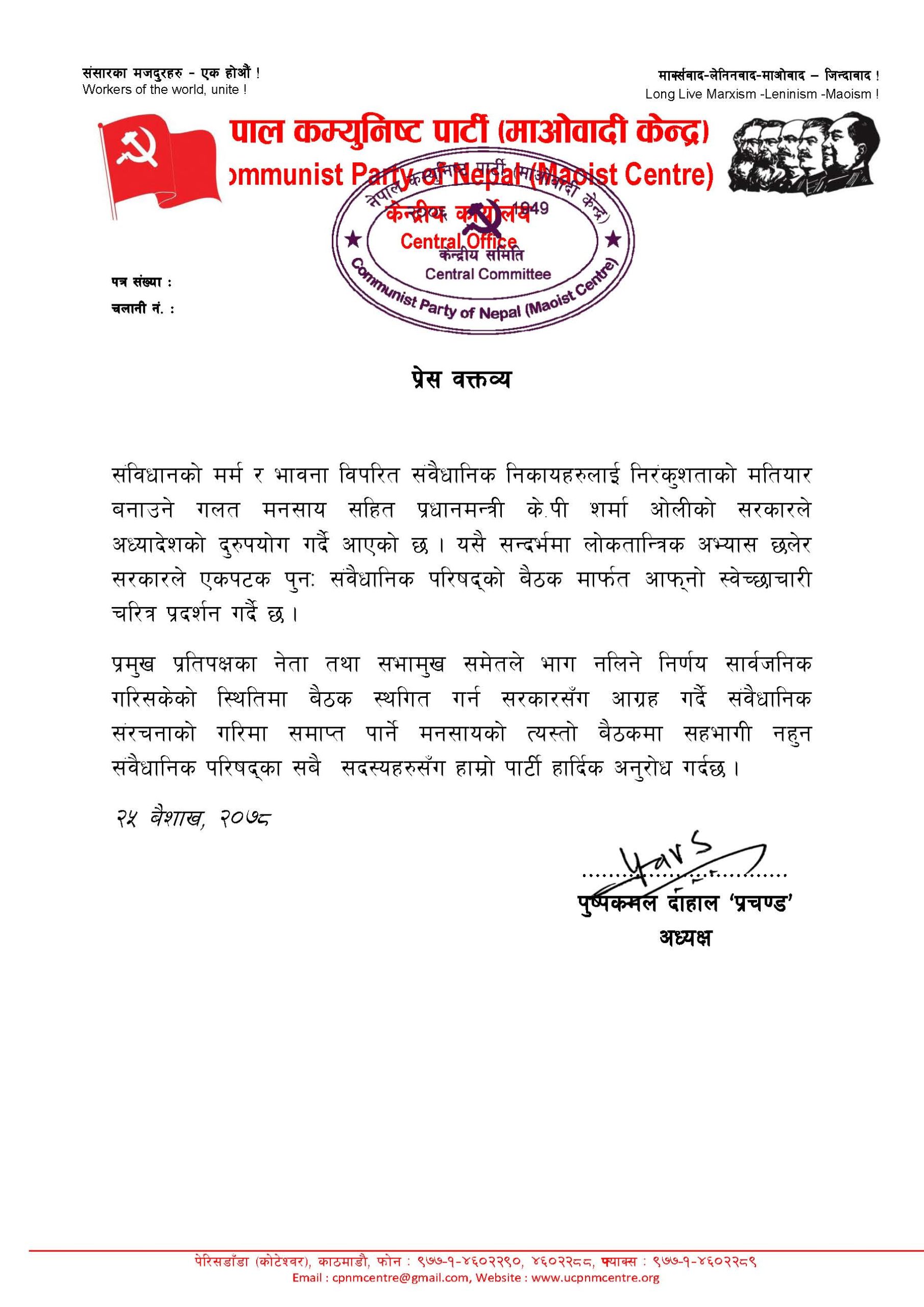 माओवादी केन्द्रका अध्यक्ष प्रचण्डले शनिबार वक्तव्य जारी गर्दै प्रमुख प्रतिपक्षका नेता तथा सभामुखले भाग नलिने निर्णय गरिसकेको स्थितिमा बैठक स्थगित गर्न सरकारलाई आग्रह गरेका हुन् ।