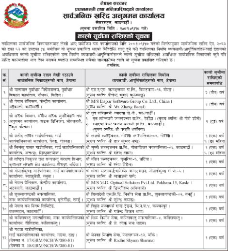उक्त कम्पनीहरूलाई तीन वर्षदेखि न्यूनतम एक वर्षसम्मका लागि कालोसूचीमा राखिएको छ । कालो सूचीमा राखिएको अवधिभर सार्वजनिक निकायको कुनै पनि खरिद कारबाहीमा भाग लिन पाउने छैनन् ।