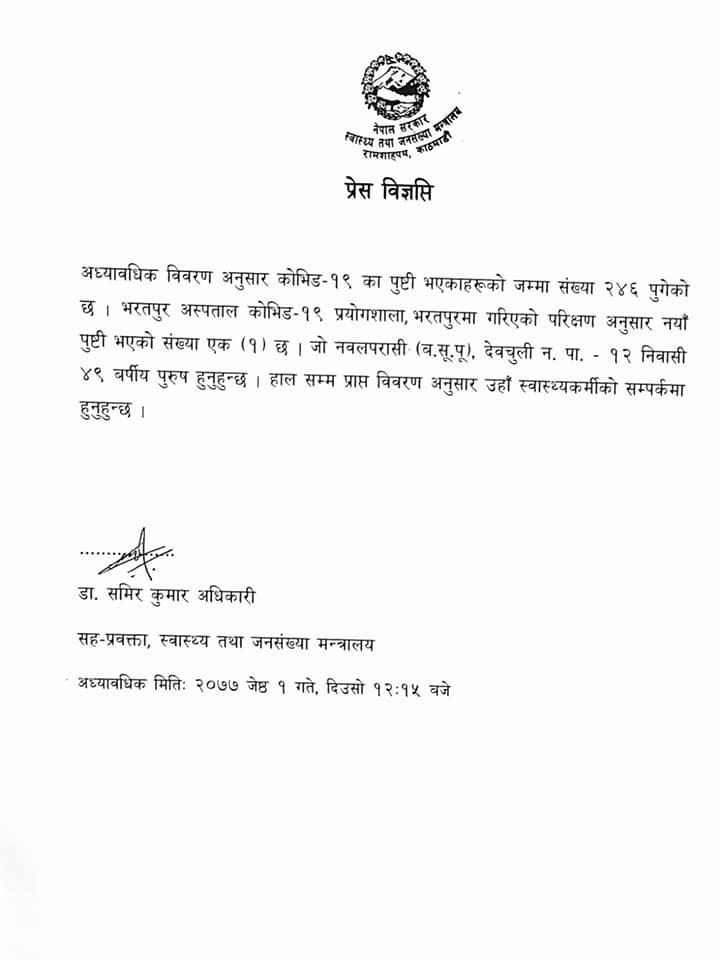 उनी स्वास्थ्यकर्मीको सम्पर्कमा रहेका छन् । योसँगै नेपालमा कोरोना संक्रमितको संख्या २४६ पुगेको छ ।