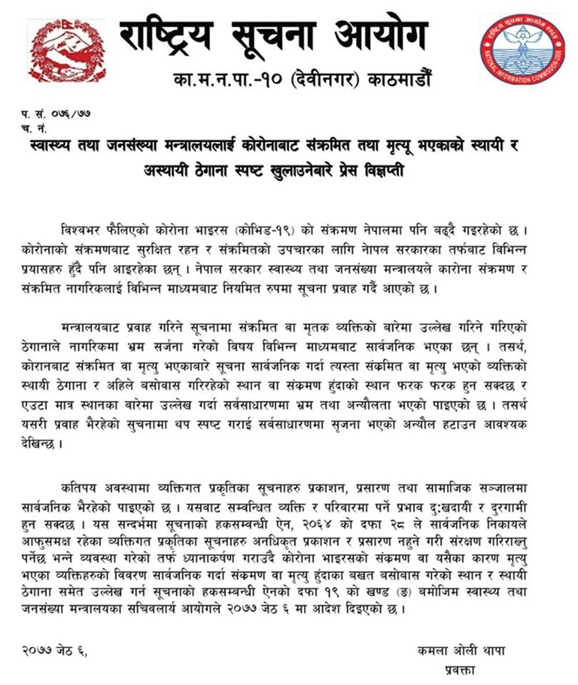 ‘मन्त्रालयबाट प्रवाह गरिने सूचनामा संक्रमित वा मृतक व्यक्तिको बारेमा उल्लेख गरिने गरिएको ठेगानाले नागरिकमा भ्रम सिर्जना गरेको विषय विभिन्न माध्यमबाट सार्वजनिक भएका छन्’, आयोगको विज्ञप्तिमा भनिएको छ, ‘तसर्थ कोरोनाबाट संक्रमित वा मृत्यु भएकाबारे सूचना सार्वजनिक गर्दा त्यसता संक्रमित वा मृत्यु भएको व्यक्तिको स्थायी ठेगाना र अहिले बसोबास गरिहरेको स्थान वा संक्रमण हुँदाको स्थान फरकफरक हुन सक्दछ र एउटा मात्र स्थानका बारेमा उल्लेख गर्दा सर्वसाधारणमा भ्रम तथा अन्यौलता भएको पाइएको छ । त्यसैले यसरी प्रवाह भइइरहेको सूचना थप स्पष्ट गराई सर्वसाधारणमा सिजर्ना भएको अन्यौल हटाउन आवश्यक देखिन्छ ।’