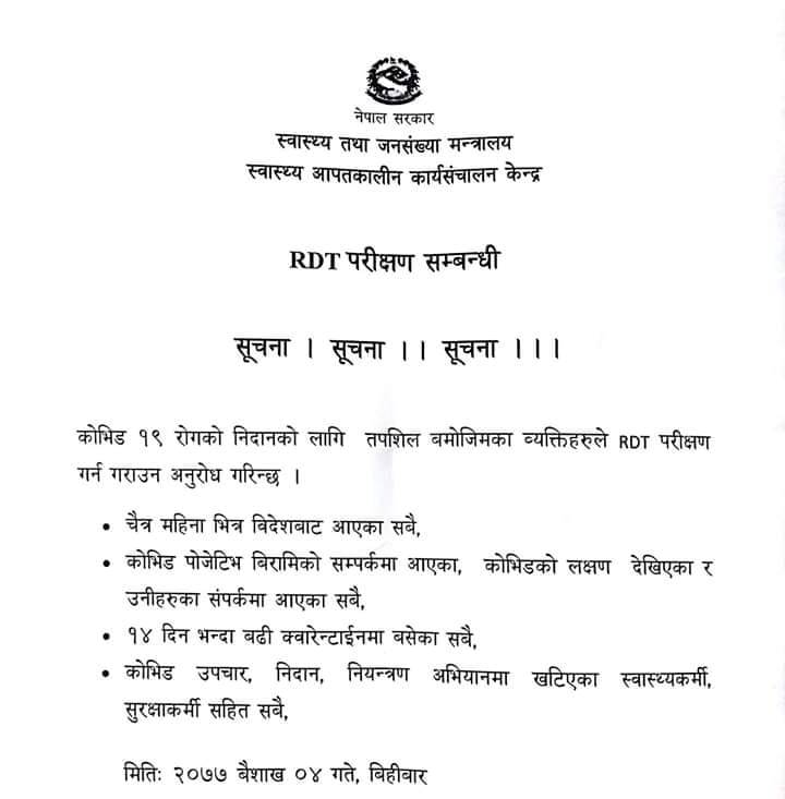 सूचना अनुसार कोभिड पोजेटिभको सम्पर्कमा आएका, लक्षण देखिएको व्यक्ति र उनीहरुको सम्पर्कमा आएका सबैलाई पनि आरडीटी परीक्षणका लागि आग्रह गरेको छ ।