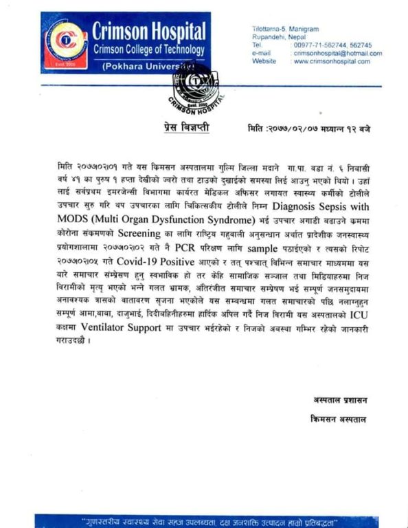 काठमाडौं – रुपन्देहीमा उपचाररत गुल्मीका कोरोना संक्रमितको मृत्यु नभएको अस्पतालले स्पष्ट पारेको छ । रुपन्देहीमा रहेको क्रिमसन अस्पतालले एक विज्ञप्ति जारी गर्दै विभिन्न अनलाइन र सामाजिक सञ्जालमा भ्रम पैदा गर्ने काम भएको भन्दै आपत्ति जनाएको छ ।