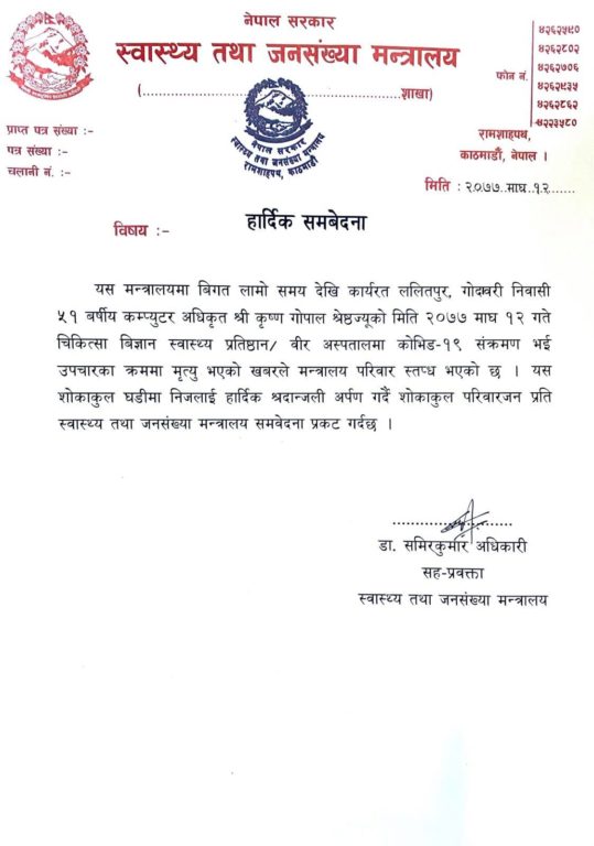 ललितपुरको गोदावरी निवासी ५१ बर्षीय कम्प्युटर अधिकृत कृष्ण गोपाल श्रेष्ठको उपचारका क्रममा वीर अस्पतालमा निधन भएको मन्त्रालयले जनाएको छ ।