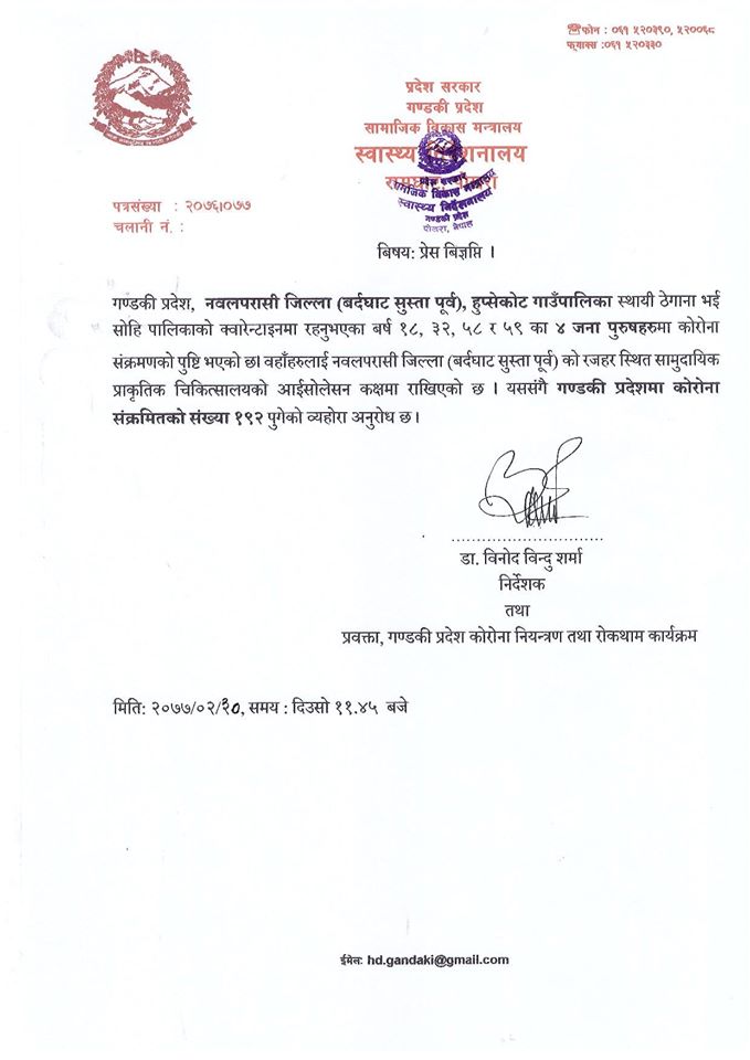गण्डकी प्रदेश स्वास्थ्य निर्देशनालयले विज्ञप्ति जारी गर्दै नवलपुरमा ४ जना संक्रमित थपिएको जनाएको छ ।