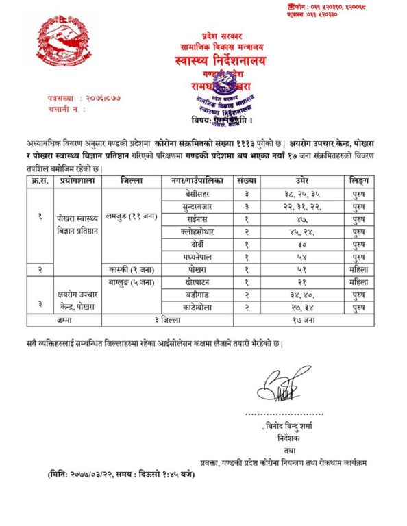 क्षयरोग उपचार केन्द्र, पोखरा र पोखरा स्वास्थ्य बिज्ञान प्रतिष्ठान गरिएको परीक्षणमा गण्डकी प्रदेशमा थप भएका नयाँ १७ जना संक्रमित फेला परेका हुन् ।