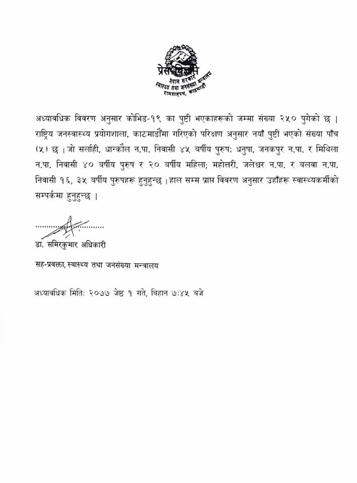 ‘पछिल्लो अध्यावधिक विवरणअनुसार २५० भएकोमा प्राविधिक कारणले पहिले नै पुष्टि भएका पाँचजनाको विवरण पुनः रिपोर्टिङ भएको जानकारी गराउन चाहन्छु,’ उनले भनेका छन् ।