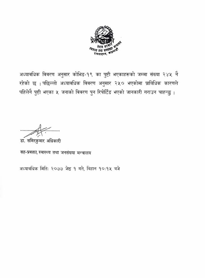 स्वास्थ्य मन्त्रालयका सहप्रवक्ता डा. समिरकुमार अधिकारीकाअनुसार अध्यावधिक विवरण अनुसार कोभिड–१९ का पुष्टि भएकाहरुको जम्मा संख्या २४५ नै हो ।