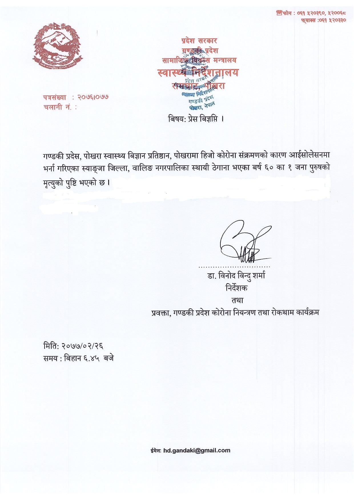 योसँगै नेपालमा कोरोना संक्रमणका कारण मृत्यु हुनेको संख्या १४ पुगेको छ । स्वास्थ्य निर्देशनालय गण्डकीका अनुसार पोखरा स्वास्थ्य बिज्ञान प्रतिष्ठान, पोखरामा आइतबार कोरोना संक्रमणको कारण आईसोलेसनमा भर्ना गरिएका स्याङ्जाका ६० वर्षीय वृद्धको निधन भएको हो ।