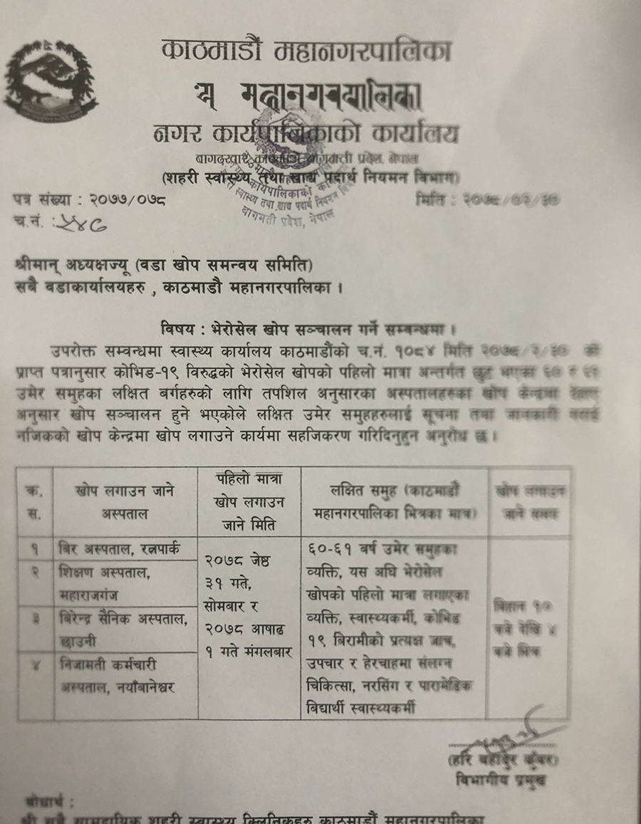 भेरोसेल खोपको पहिलो मात्रा लगाउन छुटेका ६० र ६१ वर्ष उमेर समूहका जयेष्ठ नागरिकलाई खोप लगाउन सुरु गर्न जिल्ला स्वास्थ्य कार्यलय काठमाण्डुले परिपत्र गरेअनुसार भोलिदेखि फेरि खोप कार्यक्रम सञ्चालन गर्न लागिएको महानगरपालिकाको सहरी स्वास्थ्य तथा खाद्य पदार्थ नियमन विभागका प्रमुख हरिबहादुर कुँवरले जानकारी दिए ।