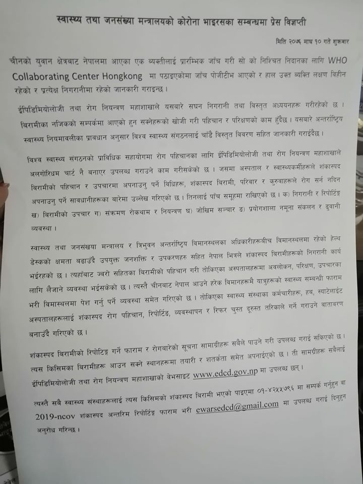 मन्त्रालयले जारी गरेको विज्ञप्तिमा भनिएको छ, ‘चीनको युवान क्षेत्रबाट नेपालमा आएका एक व्यक्तिलाई प्रारम्भिक जाँच गरी सो को निश्चित निदानका लागि डब्लुएचओ कोल्याबोरेटिङ सेन्टर हङकङमा पठाइएकोमा जाँच पोजेटिभ आएको र हालल उक्त व्यक्ति लक्षणविहीन रहेको र प्रत्यक्ष निगरानीमा रहेको जानकारी गराइन्छ ।’