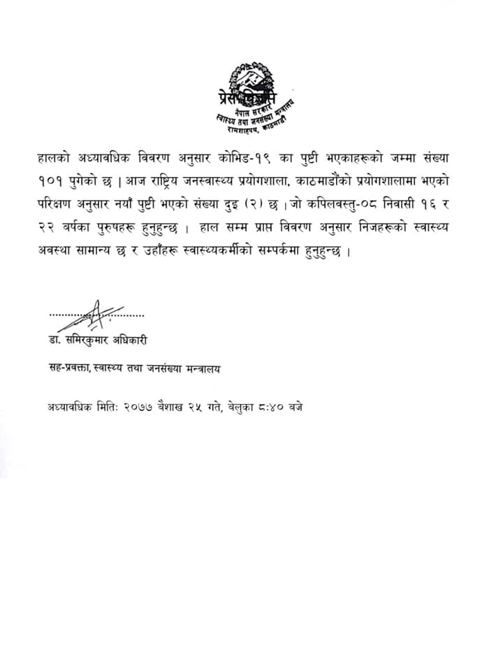 योसँगै नेपालमा कोरोनाबाट संक्रमित हुनेको संख्या १०१ पुगेको छ ।