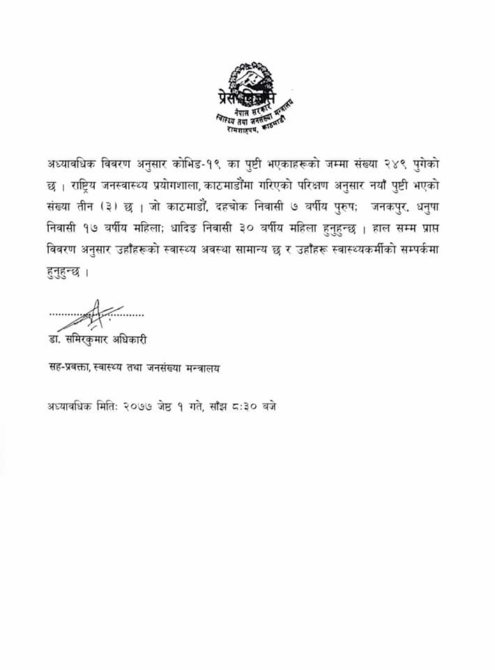 त्यस्तै जनकपुरका १७ वर्षीया महिला र धादिङका ३० वर्षीया महिलामा कोरोना भाइरसको संक्रमण भएको मन्त्रालयले जनाएको छ । मन्त्रालयका सहप्रवक्ता डा. समिरकुमार अधिकारीले सबै जना अस्पतालमा चिकित्सकको निगरानीमा रहेको बताएका छन् ।