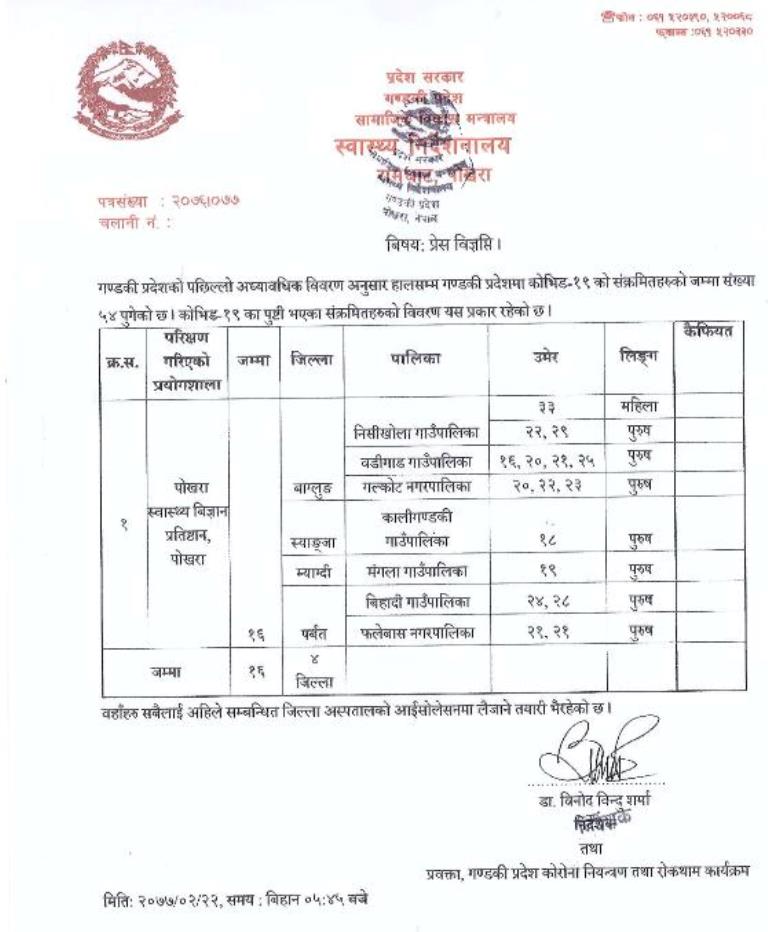 गण्डकी प्रदेशको स्वास्थ्य निर्देशनालयले बिहीबार बिहान प्रेस विज्ञप्ति जारी गरी बाग्लुङ, स्याङ्जा, म्याग्दी र पर्वत जिल्लामा थप संक्रमित देखिएको जानकारी दिएको हो ।