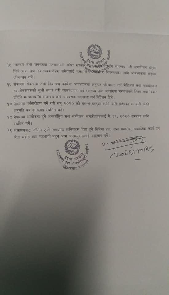 १८. नेपालमा आयोजना हुने अन्तर्रा्ष्ट्रिय सभा सम्मेलन समारोहहरूलाई मे ३१ २०२० सम्मका लागि स्थगित गर्ने ।